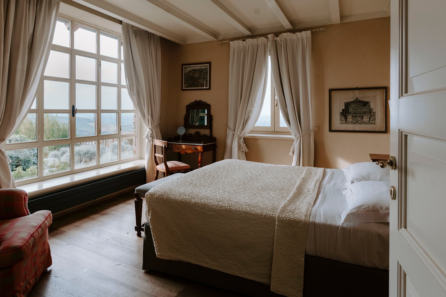 Camminando tra le stanze, si percepisce il respiro del passato: mobili in legno, tappeti antichi, coperte finemente ricamate, dettagli che parlano di sobrietà, autenticità e legame viscerale con il territorio. Le dieci camere — sette doppie, una junior suite e due suite — sono tutte panoramiche e personalizzate con gusto dalle Signore Einaudi. Gli arredi provengono dalle dimore storiche della famiglia, e ogni finestra incornicia un paesaggio che cambia con la luce, dalle colline morbide fino alle Alpi che si stagliano in lontananza.