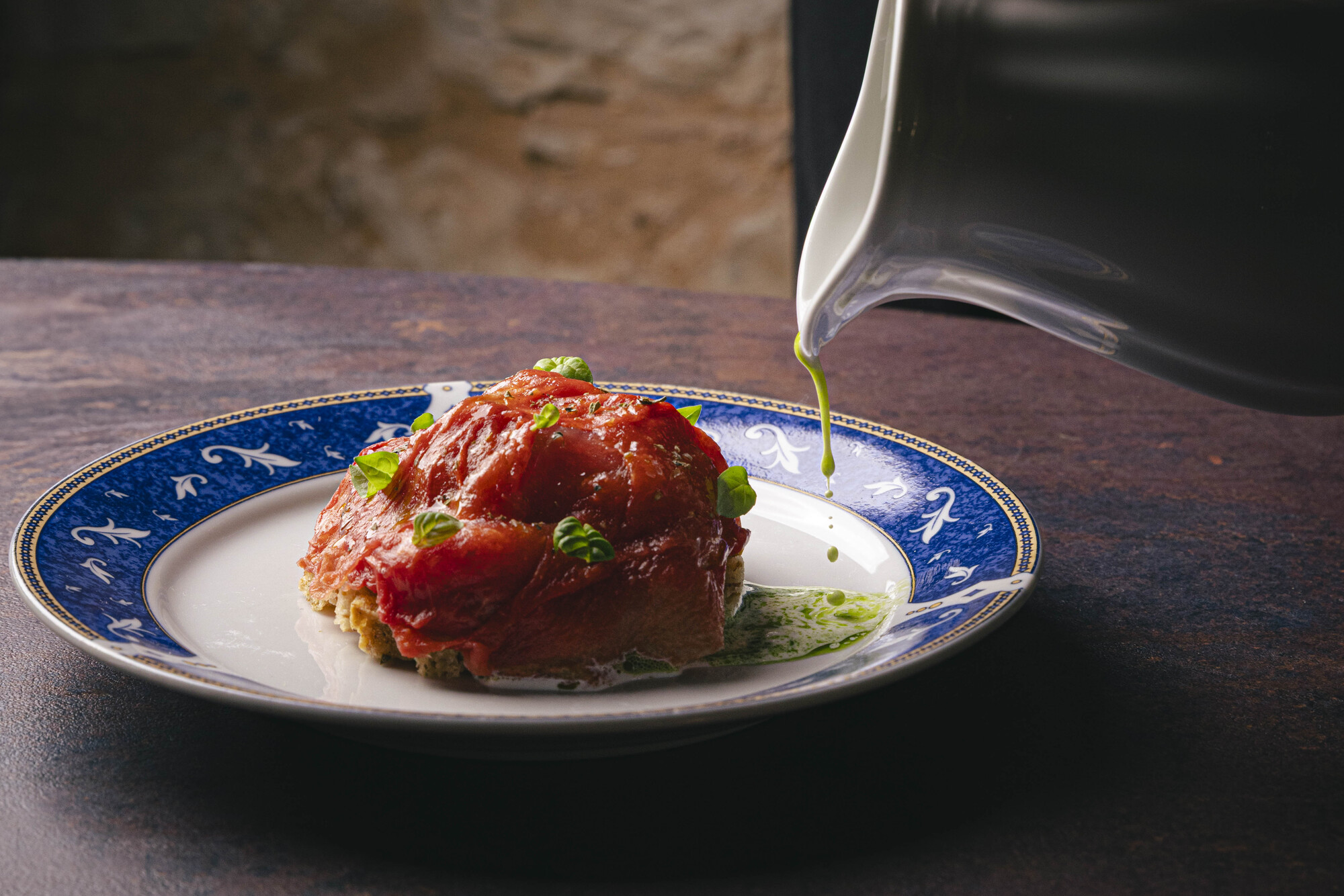 Tra i piatti più rappresentativi c’è il Risotto alla Sorrentina: cotto in acqua di pomodoro distillata, questa viene poi servita in coppa da cocktail con olio al basilico, da bere in accompagnamento. Il sorso smorza con freschezza la rotondità lattica del piatto, mentre l’affumicatura della polvere di pomodoro bruciato ci ricorda la crosticina dello gnocchetto gratinato. Il racconto si fa duplice: da un lato un piatto icona per intensità gustativa, enfatizzata dalla mantecatura con mozzarella affumicata; dall’altro abbiamo la storia di un Lorenzo bambino che chiedeva sempre gli gnocchetti alla Sorrentina e, puntualmente, riceveva un risotto per via della sua celiachia. Oggi quella memoria diventa alta cucina, in bilico tra gioco sensoriale e narrativa autobiografica.