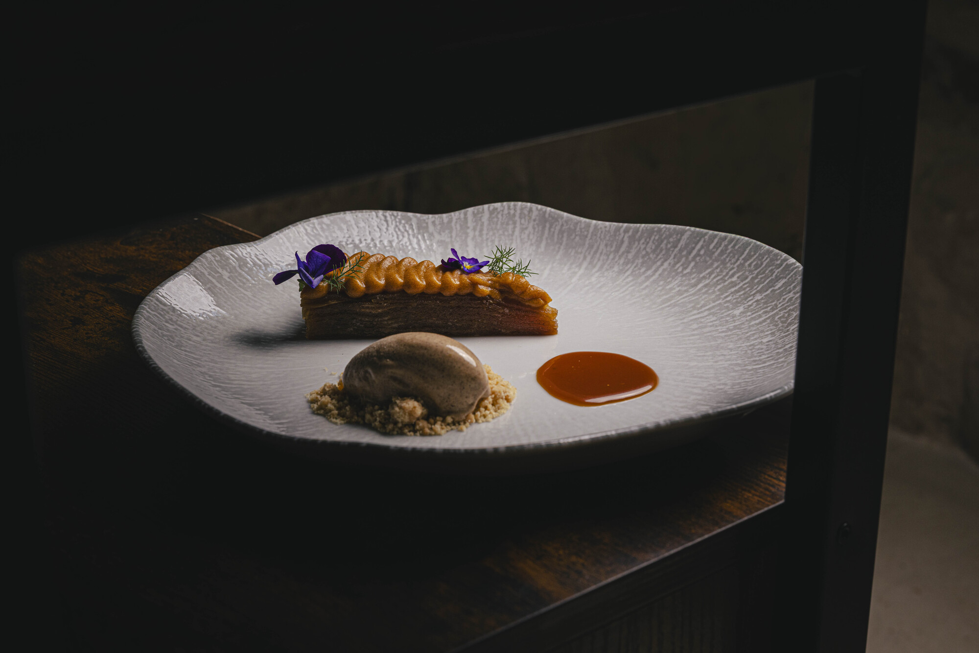 La brace ritorna con il Cardoncello, diventando materia prima di sapore. Il fungo, compatto e succoso, viene lucidato da un fondo vegetale e accompagnato dalle note agrumate di tosazu e ponzu al limone. A lato, una quenelle di lampone alla brace sorprende per acidità affumicata, temperata da una crème fraîche di latticello: un contrasto netto ma armonioso dove la materia prima resta protagonista.