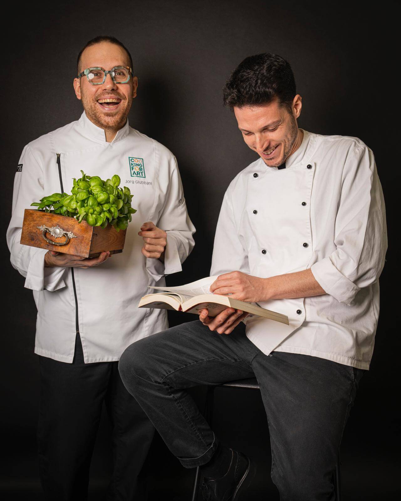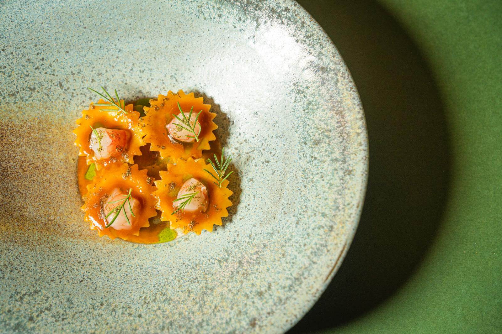 Matteo Rezzano non è da solo ai fornelli. Al suo fianco, lavora il cuoco Jorg Giubbani — premiato con una stella Michelin durante la sua carriera. Nasce così una collaborazione sinergica a quattro mani, in grado di sorprendere innovando con sensibilità e fantasia la cucina ligure tradizionale. Le loro personalità si sono rivelate complementari. La filosofia più minimalista di Matteo — che al ristorante si occupa del “blu”, ovvero tutto ciò che riguarda il mare — incontra l’estro creativo e orientato al vegetale di Jorg, che non a caso si occupa del “verde”, con una particolare propensione per la valorizzazione dei germogli e delle piante aromatiche (coltivate e curate da lui stesso negli orti dell’entroterra).